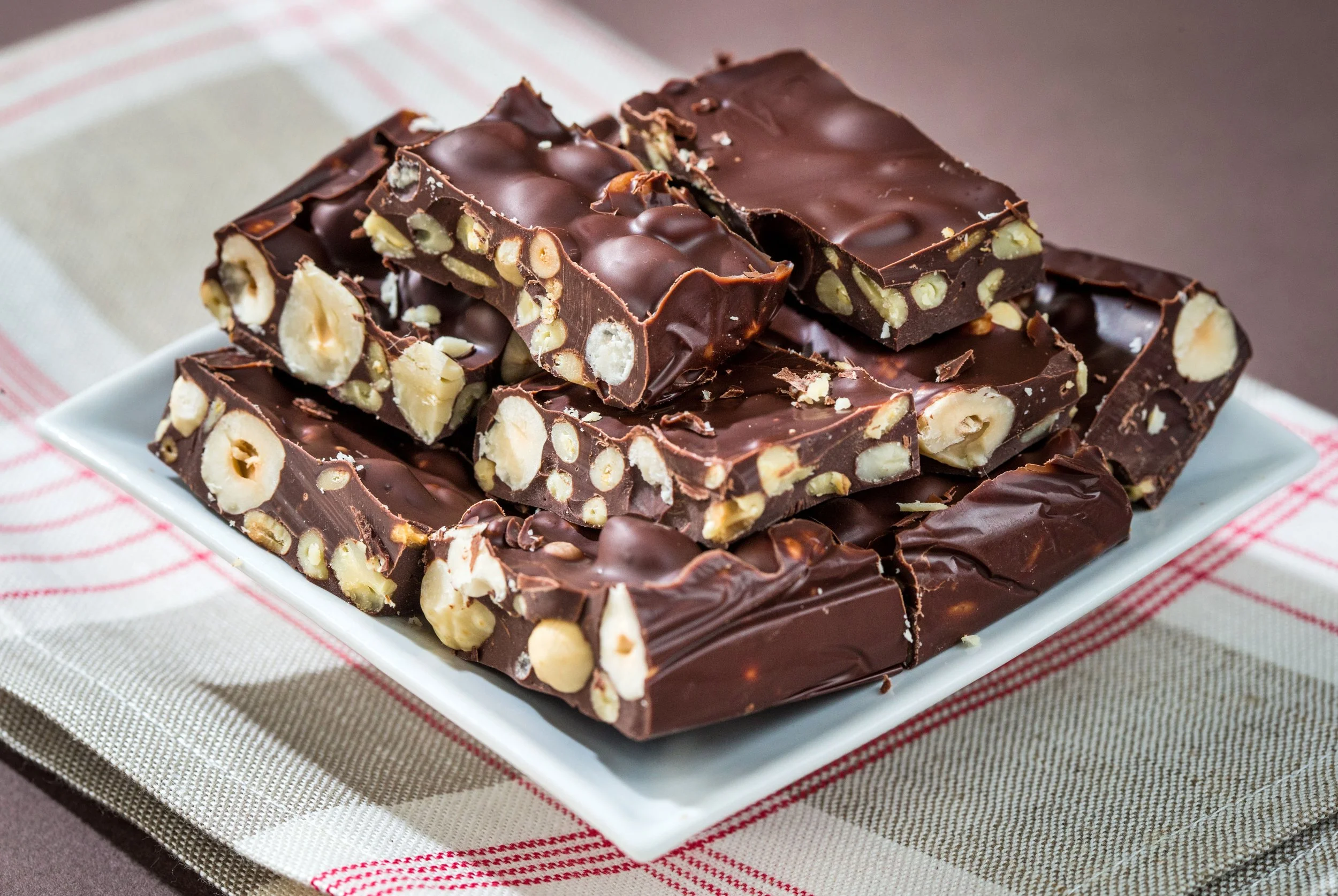 Make chocolate: In a medium saucepan, melt the coconut butter over low heat. Remove from heat and stir in the cocoa (or cacao) powder, maple syrup, and salt until smooth (or use a food processor). Stir in half of the almonds and coconut.